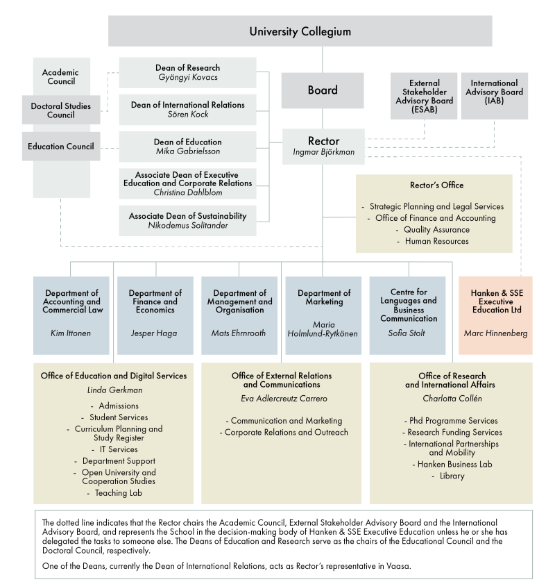 Explanation of chart: The dotted line indicates that the Rector chairs the Academic Council, External Stakeholder Advisory Board and the International Advisory Board, and represents the School in the decision-making body of Hanken & SSE Executive Education unless he or she has delegated the tasks to someone else.