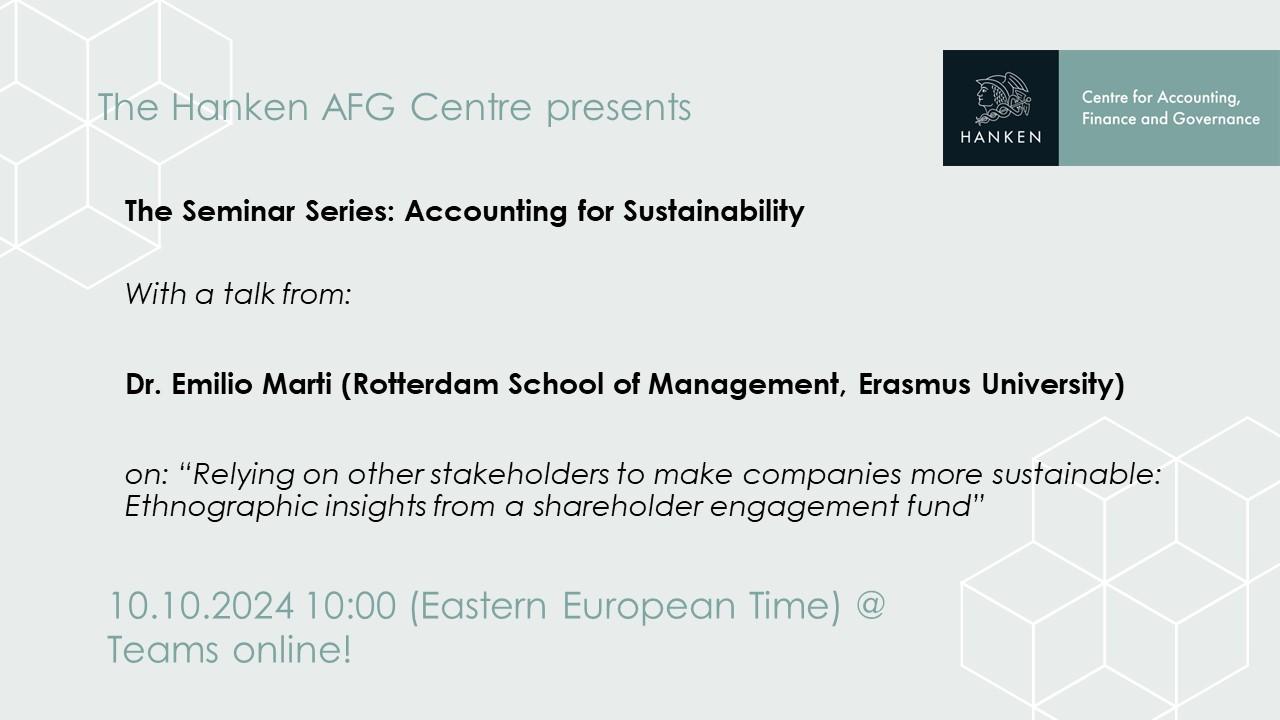 Dr. Emilio Marti from Rotterdam School of Management, Erasmus University will talk about his research (co-written with Tanja Ohlson from University of New South Wales Sydney and Falko Paetzold from University of Zurich)  titled "Relying on other stakeholders to make companies more sustainable: Ethnographic insights from a shareholder engagement fund"