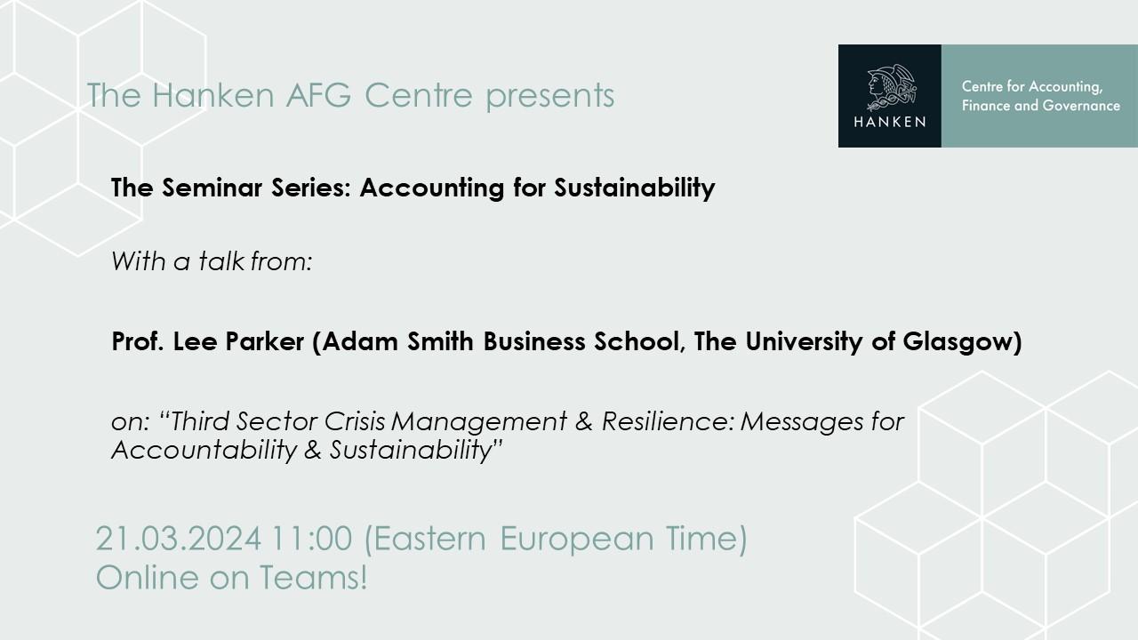 Lee Parker will talk about his new research: Third Sector Crisis Management & Resilience: Messages for Accountability & Sustainability
