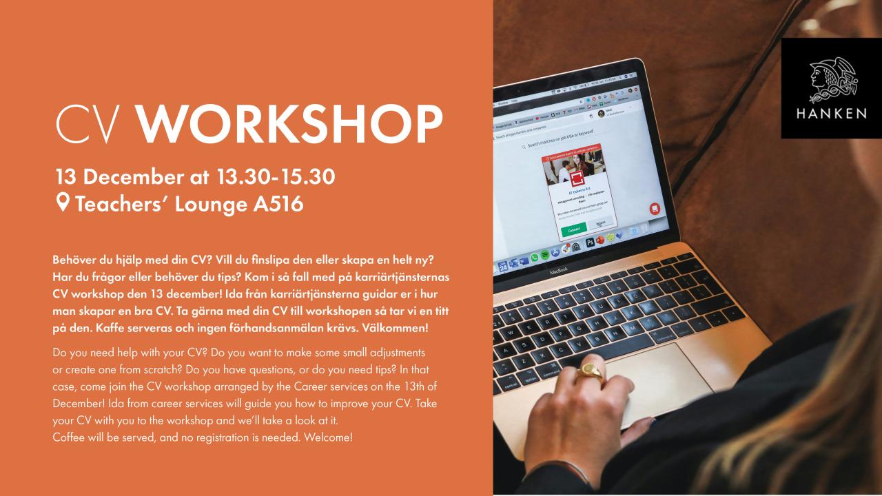 Do you need help with your CV? Do you want to make some small adjustments or create one from scratch? Do you have questions, or do you need tips? In that case, come join the CV workshop arranged by the Career services on the 13th of December! Ida from career services will guide you how to improve your CV. Take your CV with you to the workshop and we'll take a look at it. Coffee will be served, and no registration is needed. Welcome!