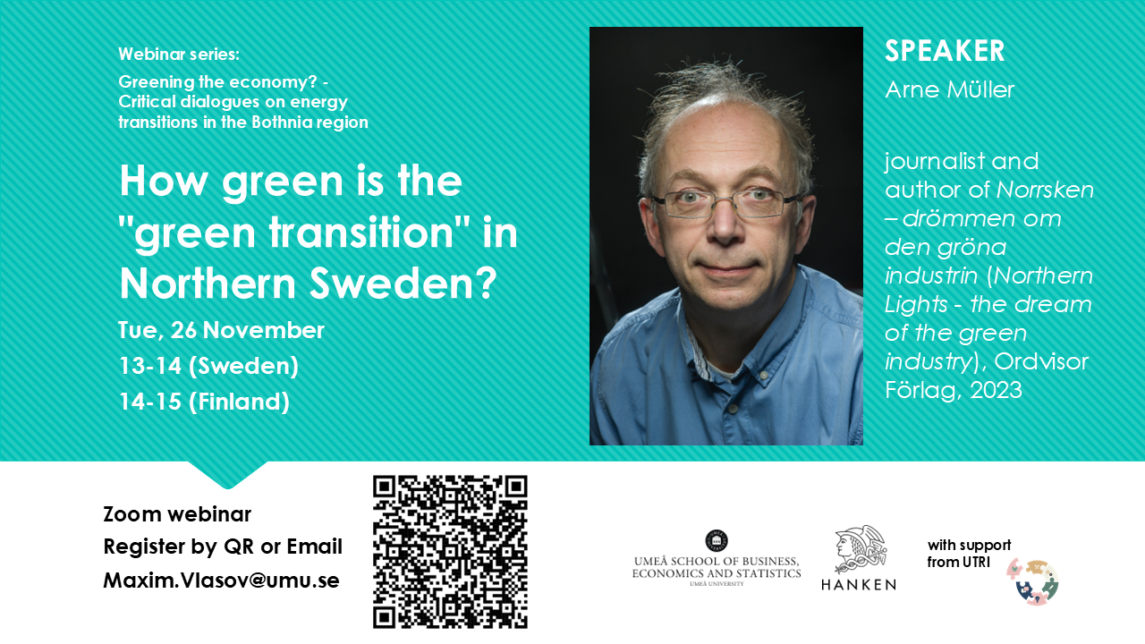 The webinar series Greening the economy? - Critical dialogues on energy transitions in the Bothnia region is a collaboration between the Research Institute for Organization and Business in Sustainable Transitions (ROBUST) at the Umeå School of Business, Economics and Statistics (Sweden) and Hanken School of Economics in Vasa (Finland).