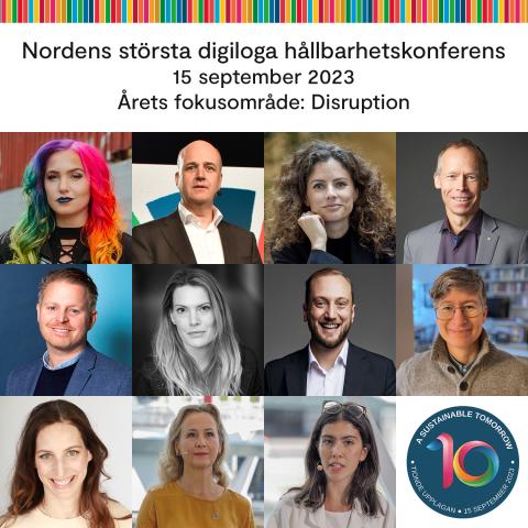 A Sustainable Tomorrow är en modern och unik mötesplats, där broar byggs mellan gräsrötter och de främsta experterna, inspiratörerna och påverkarna i samhället. Målet med digitala konferensen 2023 är att ge kunskap om vad disruption innebär och hur disruptivt tänkande kan appliceras på olika verksamheter. Keynote talare inkluderar Johan Rockström, Professor och klimatexpert, Märtha Rehnberg, Medgrundare av DareDisrupt, Fredrik Reinfeldt, Rådgivare, och Linnéa Claeson, Samhällsdebattör.