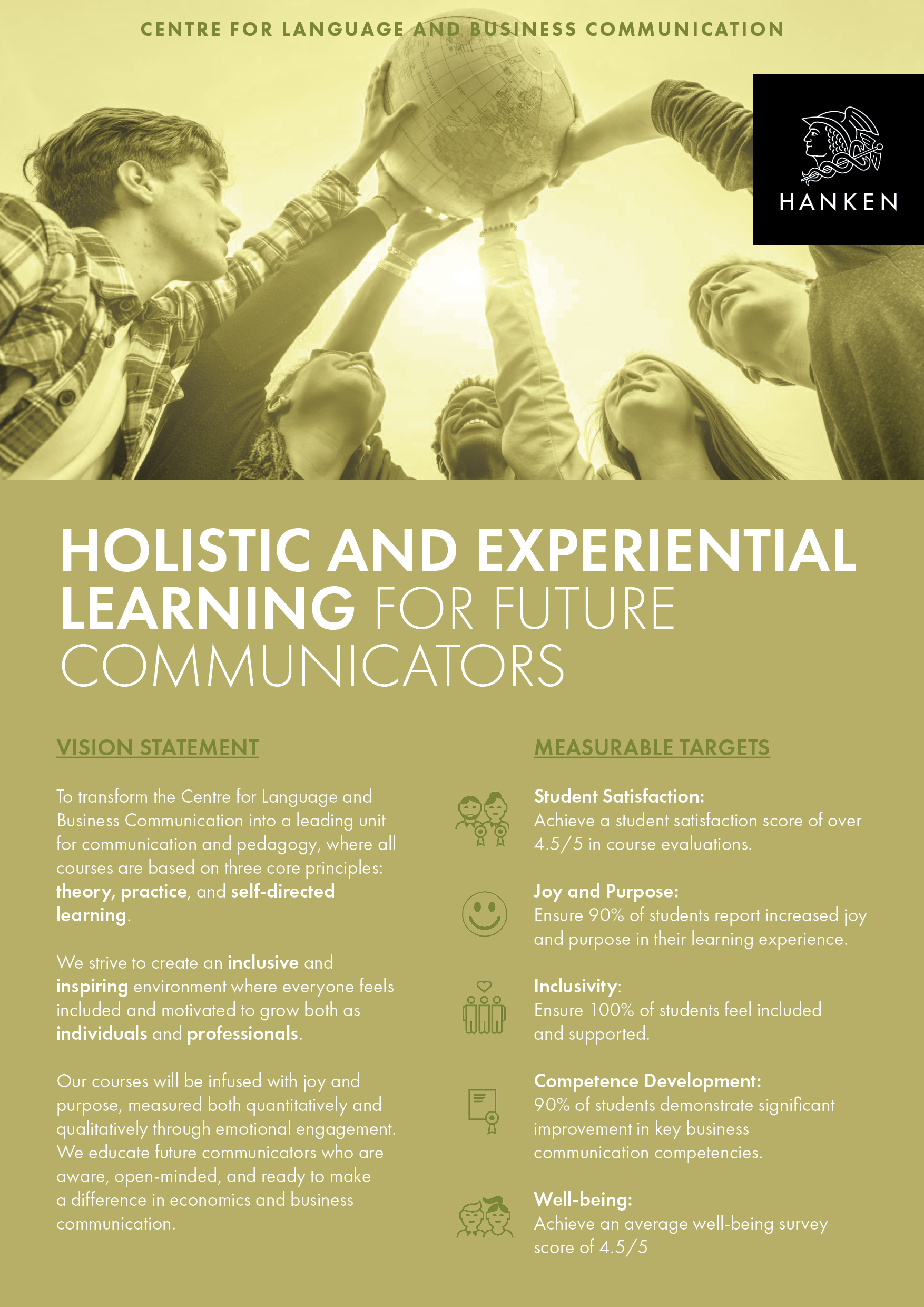 To transform the Centre for Language and Business Communication into a leading unit for communication and pedagogy, where all courses are based on three core principles: theory, practice, and self-directed learning.