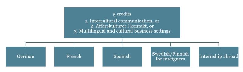 The minor in Intercultural Business Communication consist of courses of 5-20 credits in one or more foreign languages (German, French, Spanish, or Finnish/Swedish as a foreign language) and one course in intercultural communication (5 credits). The minor may also include, in some cases, or an internship abroad.