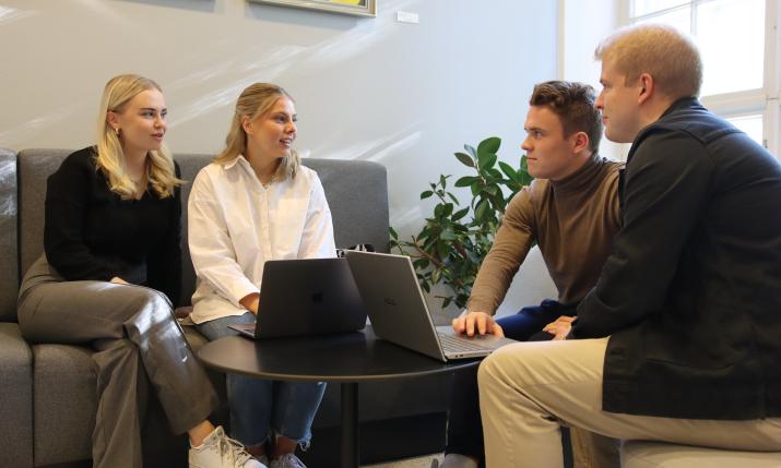 Four students sitting at a table with laptops