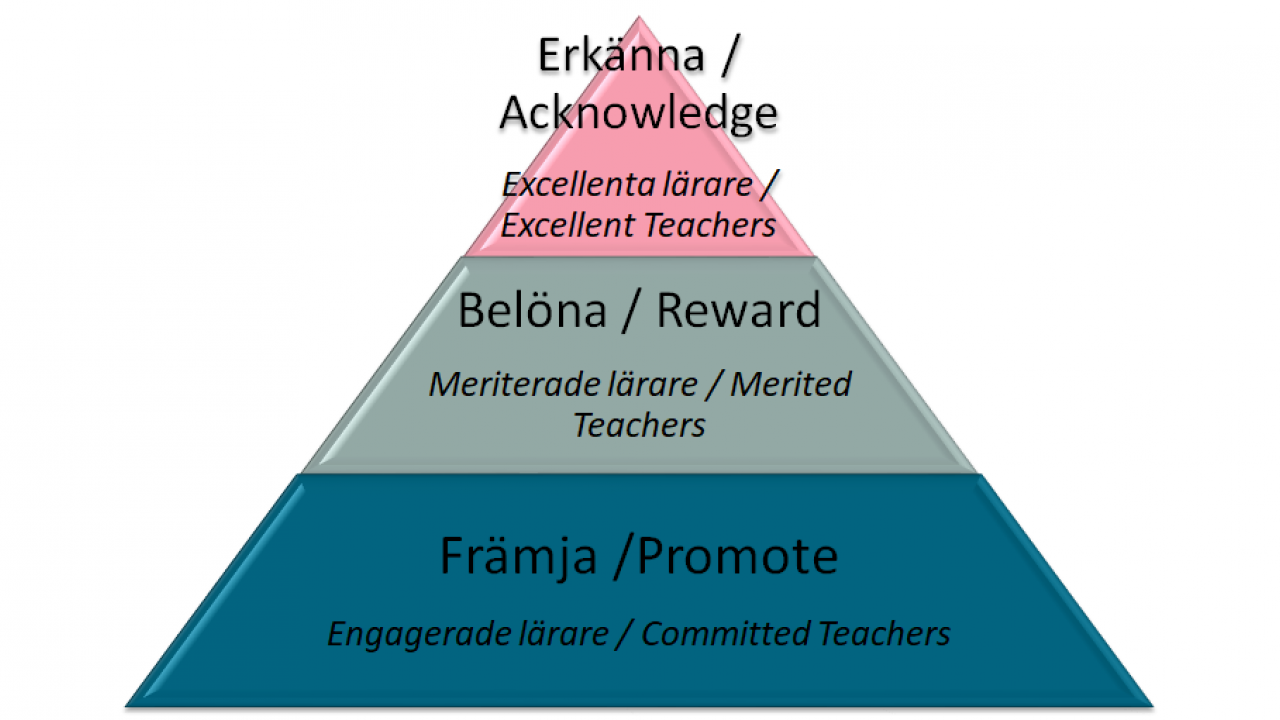 The mid-level is about rewarding. At this level, teachers that are nominated by colleagues or that have applied for an award themselves are rewarded once a year. The reward Teacher of the year is included in this level, and a new form of rewarding academic research and publications, as publications on pedagogical research will be rewarded.