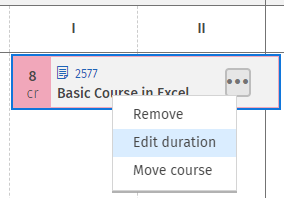 - If the course extends over two periods you can extend the timing by moving the cursor over the course and clicking on the three dots. Select "Edit duration" and click on the period you want to extend to.