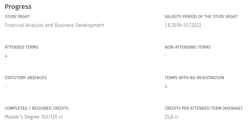 After your study right information, the application lists previous semesters, their attendance information and your completed credits.