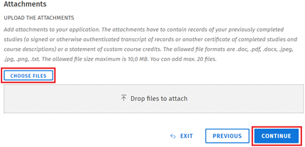 7. Add attachments by clicking Choose files or by dragging the files to the grey field that says Drop files to attach. Then click Continue.