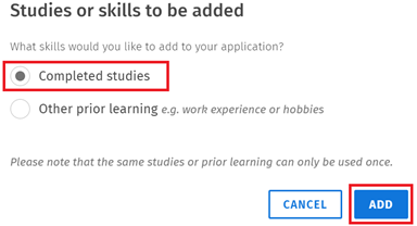 4. Click on Add information on studies or other prior learning, choose Completed studies and click on Add.