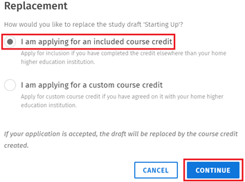 - Applying for inclusion through a study draft - If you have already added the course you are planning to include to your study plan via a study draft, you can make the application through your study draft. Then your transferred course will be shown in your study plan directly in the section where the study draft was before.