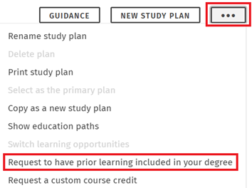 1. Open your study plan in Sisu on the Structure of studies page and click the button with three dots in the upper right corner of the page. Select the option Request to have prior learning included in your degree from the menu.