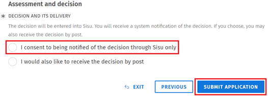 8. Choose that you want to be notified of the decision through Sisu only. We do not send the decisions by post. Click on Submit application.