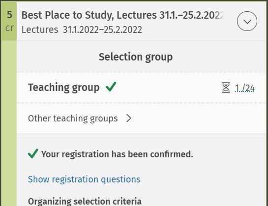 When you have registered, Sisu will preliminarily let you know whether you get a spot in the teaching or not. Please note that preliminary acceptance does not yet guarantee you a place in the course. The definite confirmation will take place after the registration period has ended.