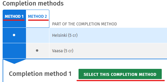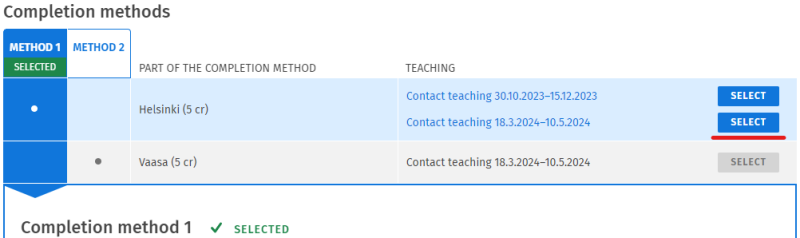 Click either on Method 1 or Method 2 depending on your place of study. If the method of completion is called Helsinki&Vaasa the teaching in that method of completion is open for students from both places of study. After clicking on the method, confirm the choice by clicking on "Select this completion method".