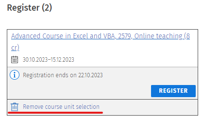 The teaching will then be moved to the "Register" phase. You can click om "Remove course unit selection". This means that the teaching is no longer selected in your study plan (the preparatory step with the blue Select-button). If you don't click on "Remove" you will receive a reminder about not having registered yet for the teaching you've selected.