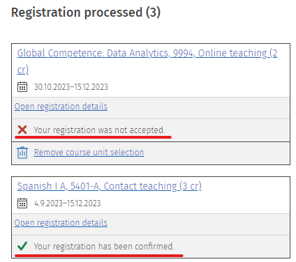 - Your registration was not accepted = You did not get a seat on the teaching. If your registration wasn't accepted despite you fulfilling all the requirements for registration the teaching group is full and you were unfortunately not selected.