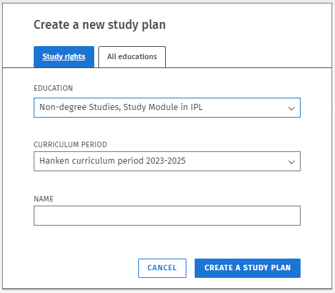 Go to the Structure of studies page and click on the New study plan button. If you only have one study right at Hanken, the popup Window will be filled in automatically. If you have several study rights, you need to select which one you want to create the study plan for. Give your study plan a name. Click on Create a study plan.