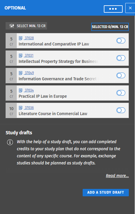 If you have a study right to the IPL module, click on the "Optional" heading to add courses you want to take. An example of the panel is shown below.