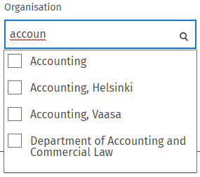 You can either type in the subject you're interested in directly in the search field, or find the subject via the organisation menu. Note, that you should select the option in the list containing the name of the subject+location, for example "Accounting, Helsinki".