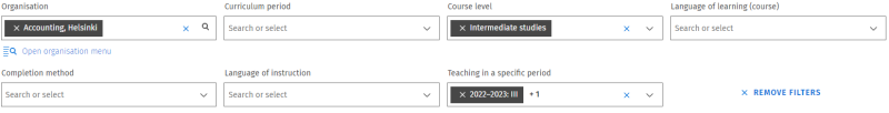 The most relevant filters are organisation, course level, language of instruction and teaching in a specific period. You can search with one or more filters at the same time. The filters are described below.