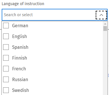 Language of instruction - Here you can filter by the language of the teaching. Please note that the language of the course might differ from the language of teaching in some cases. Click on the arrow to open the list of languages.