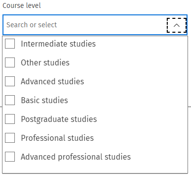 Course level - Here you can select which level of courses you want to find in your search. Click on the arrow to open the list of levels. The following levels are used at Hanken: