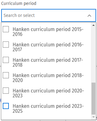 Curriculum period - With this filter you can find courses according to the curriculum period, ie. 2023-2025. Select the curriculum period that's active during the academic year you want to find courses or teaching in.