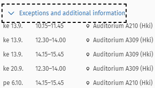 Note! As a student, you will see all lectures for a course, even lectures that are not meant for you (such as different practice lessons for different groups or lectures at the other campus, for example). Be sure to always discuss with the responsible teacher regarding when you are expected to attend.