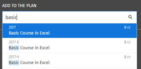 You can use this search function inside your study plan. The search field will show only if it is possible to add any freely selected studies to the section that you have clicked on. When doing a search, any selected courses will directly be added to your study plan when you click on them. Instructions are described further up on this page