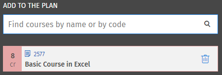 If selecting courses freely is allowed, you will find a search field under the small heading "Add to the plan" in the panel on the right hand side. The course you searched for will be selected to your study plan when you click on it. You can delete this selection by clicking on the recycle bin icon.