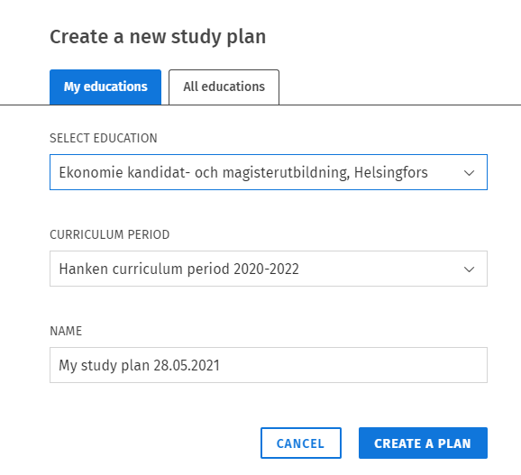 - Select My educations from the pop-up window which appears. On this tab, you can select the study plan template that applies to your study right. If you have several study rights, the Select education drop-down menu will display a list of all study plan templates that correspond to the study rights that you have been granted.