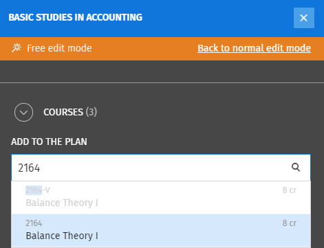 To change your study plan in Sisu using the free edit mode, follow the instructions below. In this example we are adding a course which is not listed to the minor subject in Accounting.