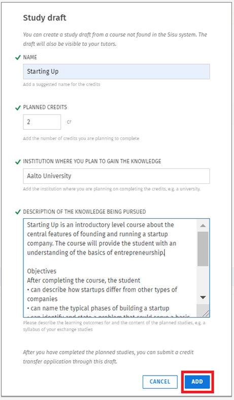 Please note that you need to create a separate study draft in Sisu for each course. Also note that if the course has already been registered, you must instead follow the instructions on the page Completed credits in Sisu Opens in new window to add the course to the study plan.