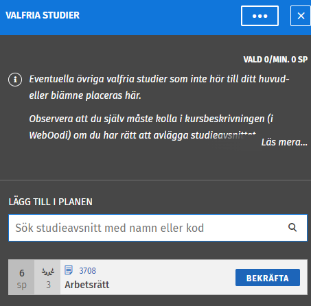 Aktivera sen det fria redigeringsläget genom att klicka på de tre punkterna överst i panelen till höger och sen på Fritt redigeringsläge. Klicka sen på "Lägg till utfört studieavsnitt" för att se en lista på dina utförda prestationer som inte ännu finns placerade i studieplanen.