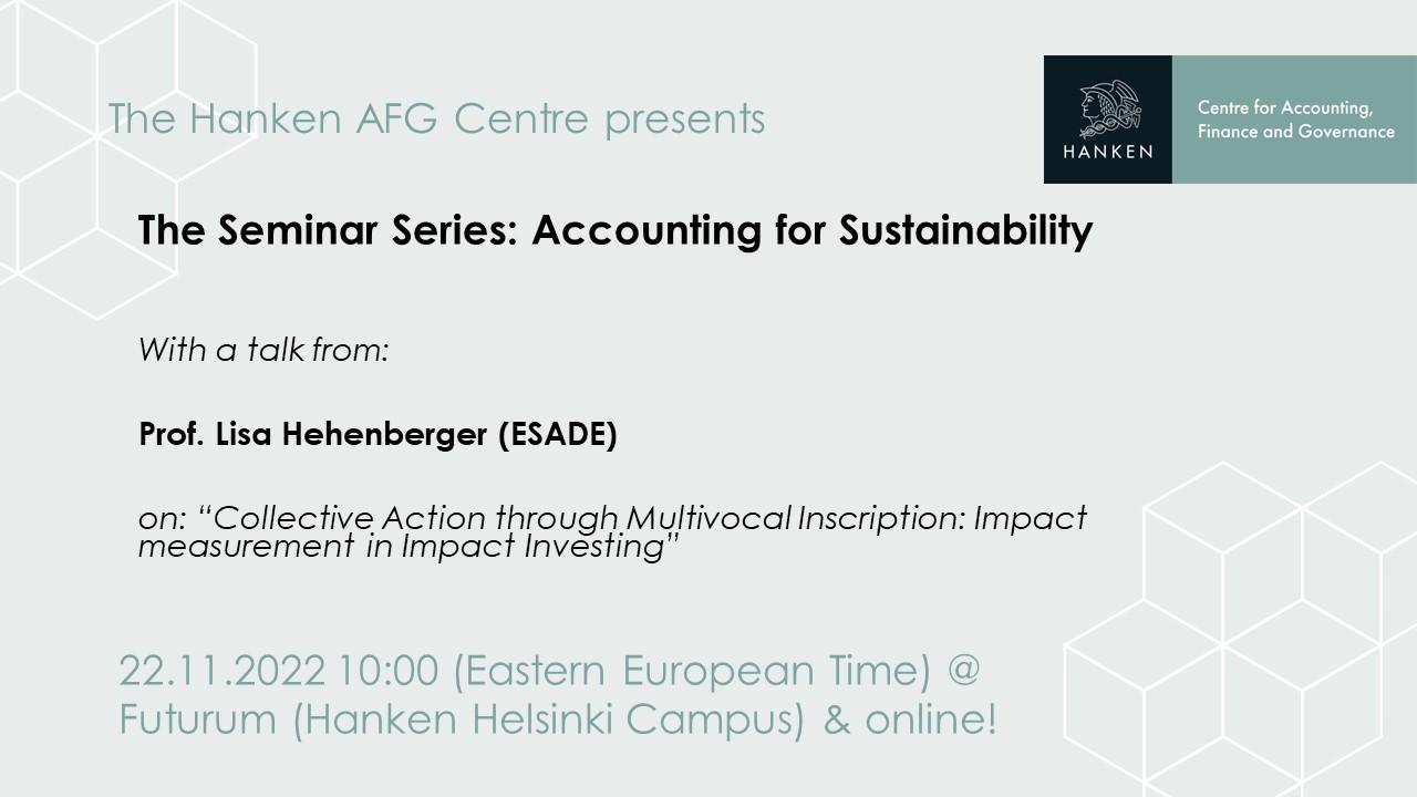 Inhiberad: Accounting for Sustainability seminarie: Del 2 Time 22.11.2022, 10:00 22.11.2022, 11:00 Place Helsingfors Room Futurum / Online En ny seminarieserie organiserad av Institutionen för redovisning och handelsrätt. Information in English Tags Inst_REHR