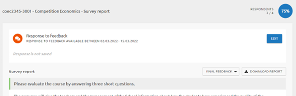 - Efter kursens slut: Studerande får en direktlänk till utvärderingen till sin e-post (inklusive påminnelser). Enkäten är aktiv i tre veckor. Läraren förväntas sedan ge en allmän respons (feedback på feedback - 14 dagar) på utvärderingsresultaten till dina studerande när utvärderingen är stängd och överväga hur kursen kan utvecklas.