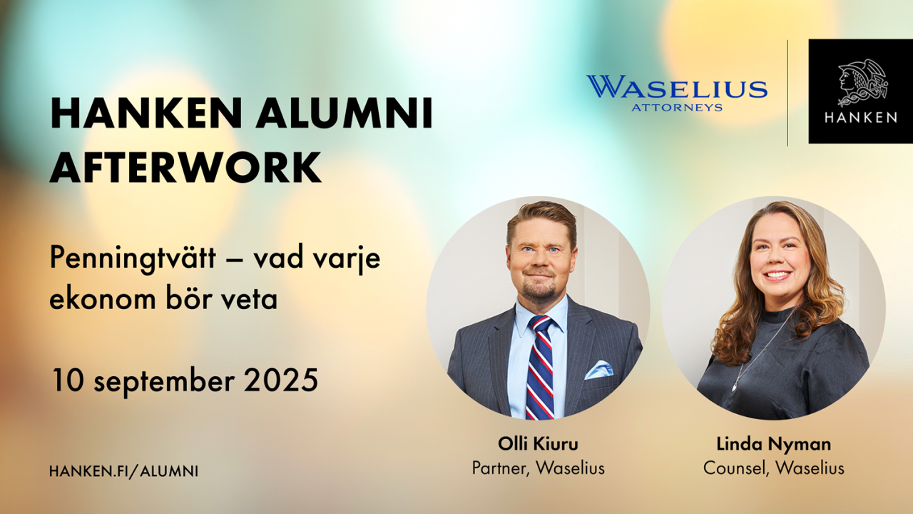Under kvällen får du ta del av en presentation med temat ”Penningtvätt – vad varje ekonom bör veta”, som presenteras av Waselius partner Olli Kiuru och counsel Linda Nyman.
