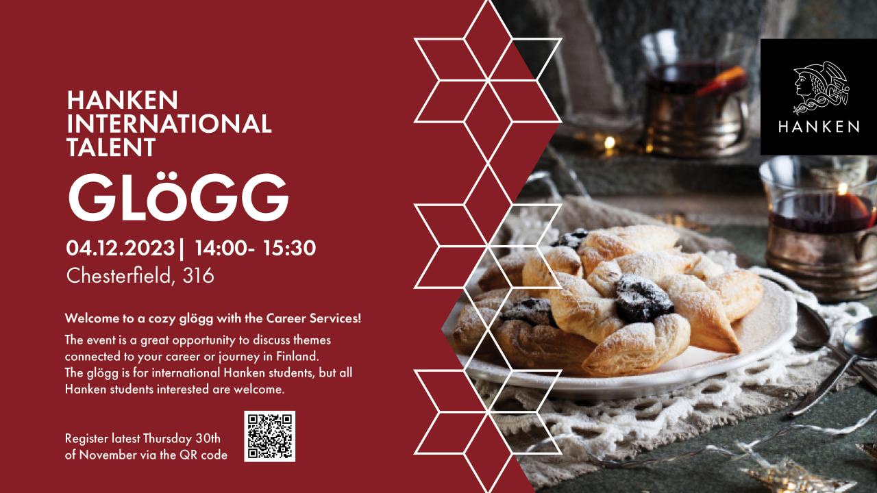 Studenter är varmt välkomna till Hanken International Talent Glögg, som är ett utmärkt tillfälle att diskutera alla teman kopplade till din karriär eller dina upplevelser i Finland. Ni är även välkomna att bara komma och umgås över en rykande kopp glögg och njuta av andra finska vinterdelikatesser.