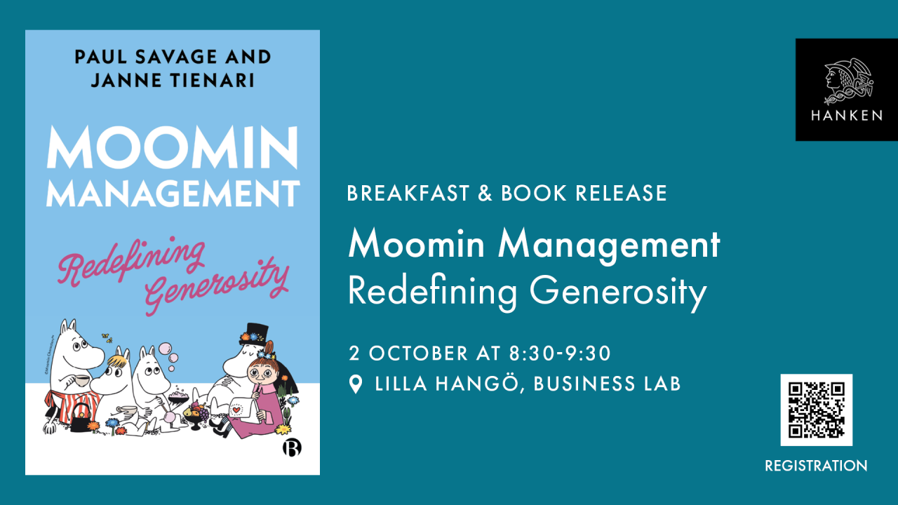 Välkommen på frukost och boklansering av boken ”Moomin Management: Redefining Generosity” på Hanken 2.10 kl. 8.30-9.30. Evenemanget är öppet men du får gärna anmäla dig via länken ovan så att vi bättre kan estimera mängden frukost. Registrering är öppen till och med 25.9.2024 klockan 12:00. Evenemenaget hålls på engelska.