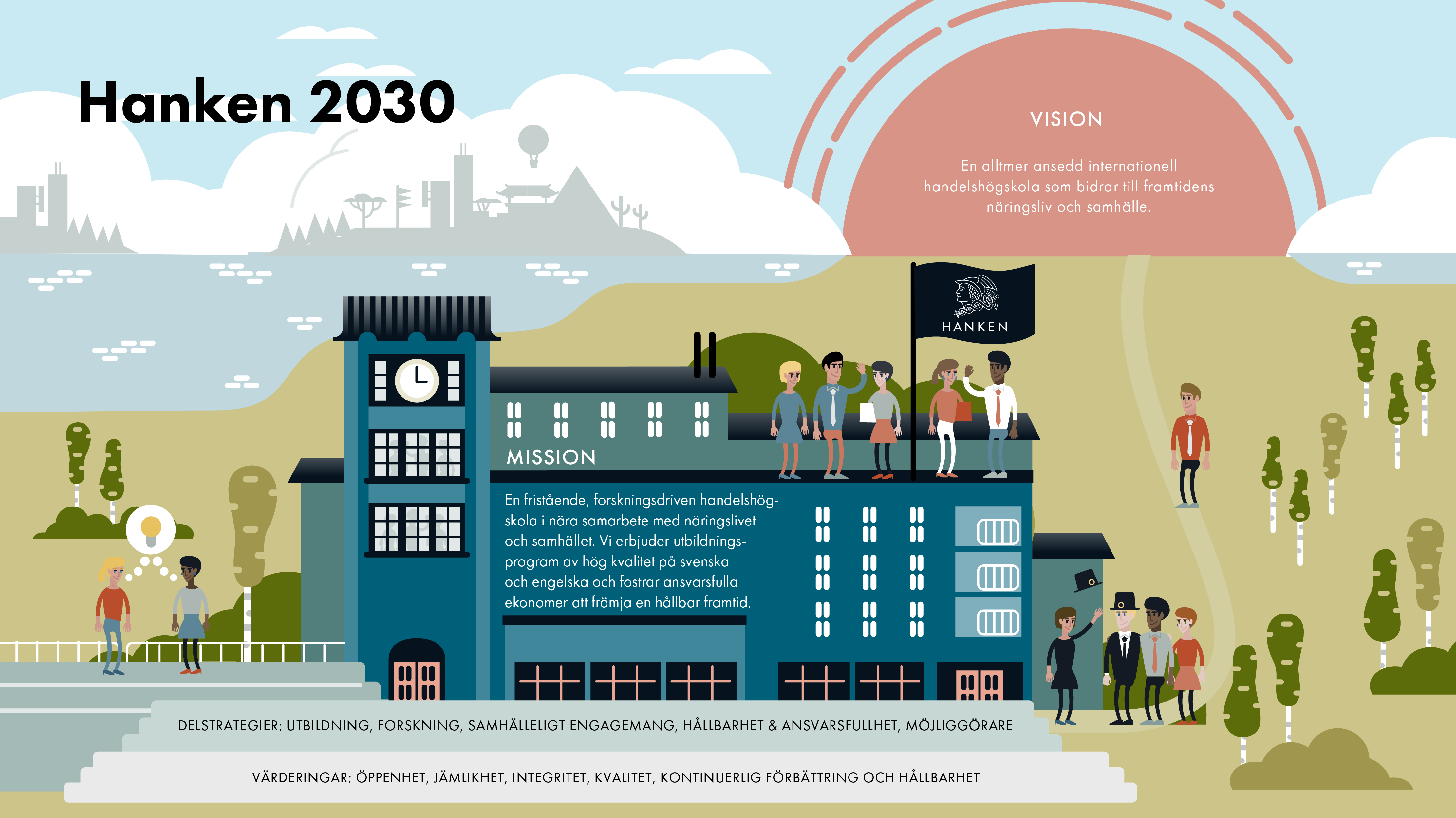 Strategin Hanken 2030 slår fast Hankens strategiska målsättningar. Missionen definierar Hankens grundläggande uppgift och visionen Hankens långsiktiga mål.