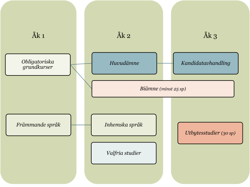 BiämneI kandidatexamen ska också ingå minst ett biämne. Ett biämne innebär minst 25 sp i ett och samma ämne. Du kan läsa mera om biämnet på sidan om kandidatexamens struktur. |