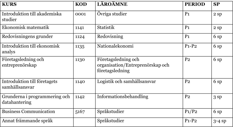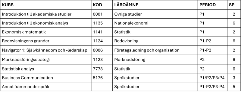Obligatoriska grunder i ekonomiska vetenskaperDu avlägger de allra flesta obligatoriska grundkurserna under ditt första studieår. Första årets obligatoriska grundkurser finns listade högre upp på denna sida. Under höstterminen av ditt andra studieår kommer du ytterligare att avlägga följande obligatoriska grundkurser: