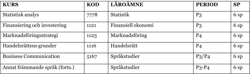 Dessa kurser avlägger du under din första vårtermin. En del av första årets studerande avlägger kursen Business Communication och/eller sitt andra främmande språk på vårterminen i stället för på höstterminen.