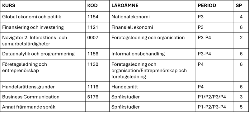 | KURS | KOD | LÄROÄMNE | PERIOD | SP |
