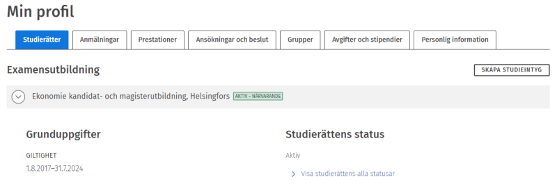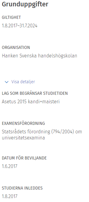 Lag som begränsar studietiden fastslår på vilken grund studierättens längd begränsas. Förordning om universitetsexamina fastslår vilken statsrådets förordning som bestämmer till exempel hur många studiepoäng en examen kräver. Datum för utfärdande är det datum när du har beviljats studierätt vid antagningen av studerande. Studiestartdatum är den första dagen på den termin som du har anmält dig som närvarande. Längst ner ser du grunden för beviljande av studierätt.