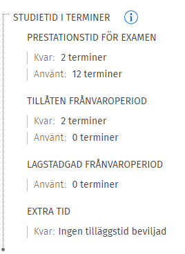 Studietid i terminer visar hur många terminer av din studierätt du har använt och hur många du har kvar samt normala och lagenliga frånvaroterminer. Längst ner syns också tilläggstid ifall sådan beviljats.