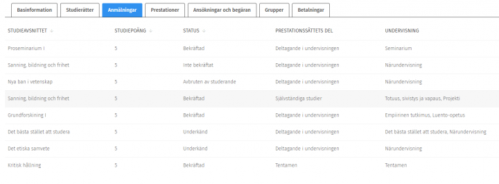 På fliken ser du all undervisning som du har anmält dig till. Du kan sortera listan på basen av studieavsnittets namn och storlek samt anmälningsstatus. Du kan inte anmäla dig till undervisning eller uppdatera anmälningar här. Mer detaljerad information om anmälningar ser du på Anmälan-sidan i Sisu.