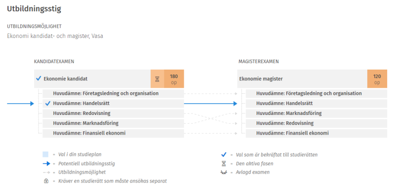 I detta avsnitt ser du alternativen för din studierätt, såsom magisterprogrammen där du kan fortsätta dina studier efter kandidatexamen. Bekräftade val märks med en blå bock och alternativen med en blå pil. Fler förklaringar ser du under grafen. Valen för utbildningsstigen (t.ex. valet av huvudämne) görs i studieplanen. Läs mer i Sisu-anvisningen för studieplanen.