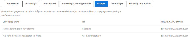 Målgrupper (till exempel studerande inom en viss studieinriktning) används som urvalskriterier när du anmäler dig till undervisning. Handledningsgrupper används för studiehandledning. Du kan inte själv redigera gruppinformationen. Kontakta studierådgivningen eller din ISP-handledare om du upptäcker fel i uppgifterna.